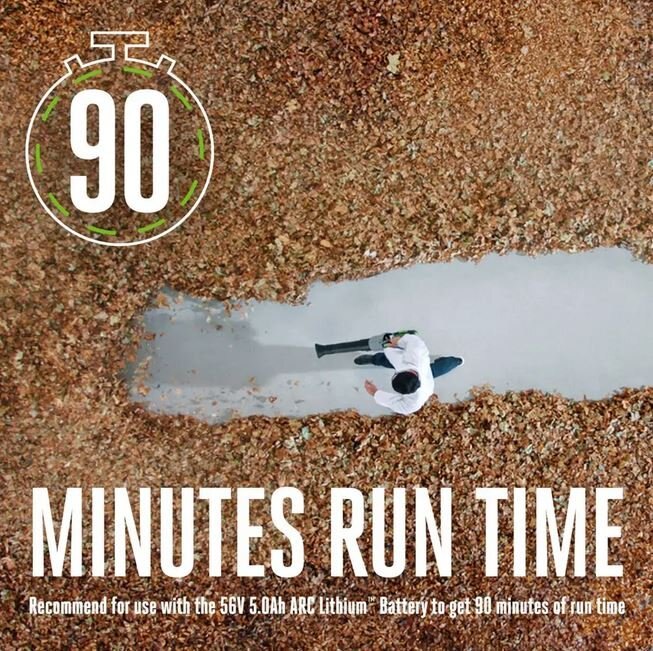 With the 5.0 Ah 56V ARC Lithium™ Battery get over 90 minutes of run time.