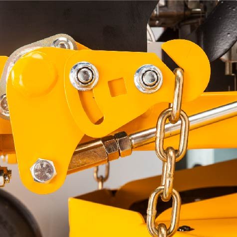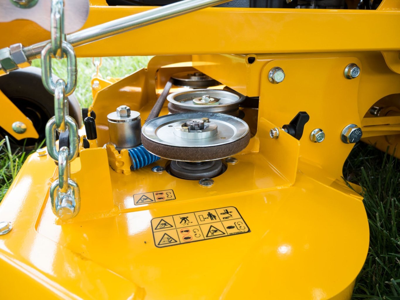 Stander ZK, X, and Intensity models have a push button deck lift. The patented push button design allows us to install strong springs to make it easy to lift the deck, while the push button lock keeps the deck from bouncing.