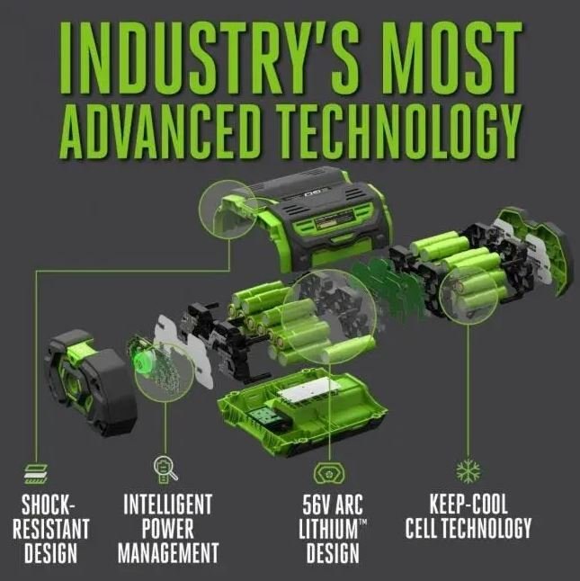 The EGO POWER+ 56-Volt 12.0Ah battery uses industry-leading ARC Lithium™ technology to deliver Power Beyond Belief™ and is compatible with all EGO outdoor power equipment.