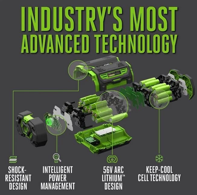 The EGO POWER+ 56-Volt 10.0Ah Battery uses industry-leading ARC Lithium™ technology to deliver Power Beyond Belief™ and is compatible with all EGO outdoor power equipment. |