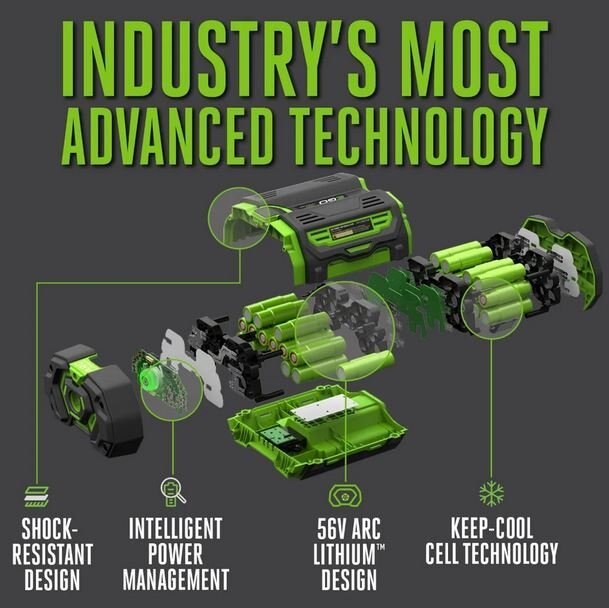 The EGO POWER+ 56-Volt 4.0Ah Battery uses industry-leading ARC Lithium™ technology to deliver Power Beyond Belief™ and is compatible with all EGO outdoor power equipment.